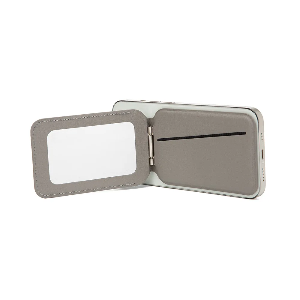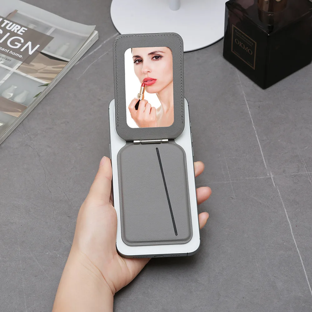 Fashion Magnetic Wallet Stand with Mirror, Men Women Compatible Magsafe Phone Holder Adjustable Kickstand PU Leather Card Holder