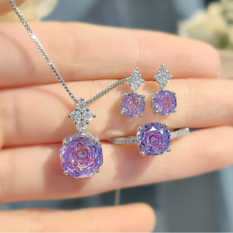 Color: purple diamond pendant, purple diamond stud earrings, purple diamond ring (adjustable opening), Champagne pendant, champagne stud earrings, champagne ring (adjustable opening),lvzuan pendant, lvzuan stud earrings, lvzuan ring (adjustable opening), pink diamond pendant, pink diamond stud earrings, pink diamond ring