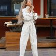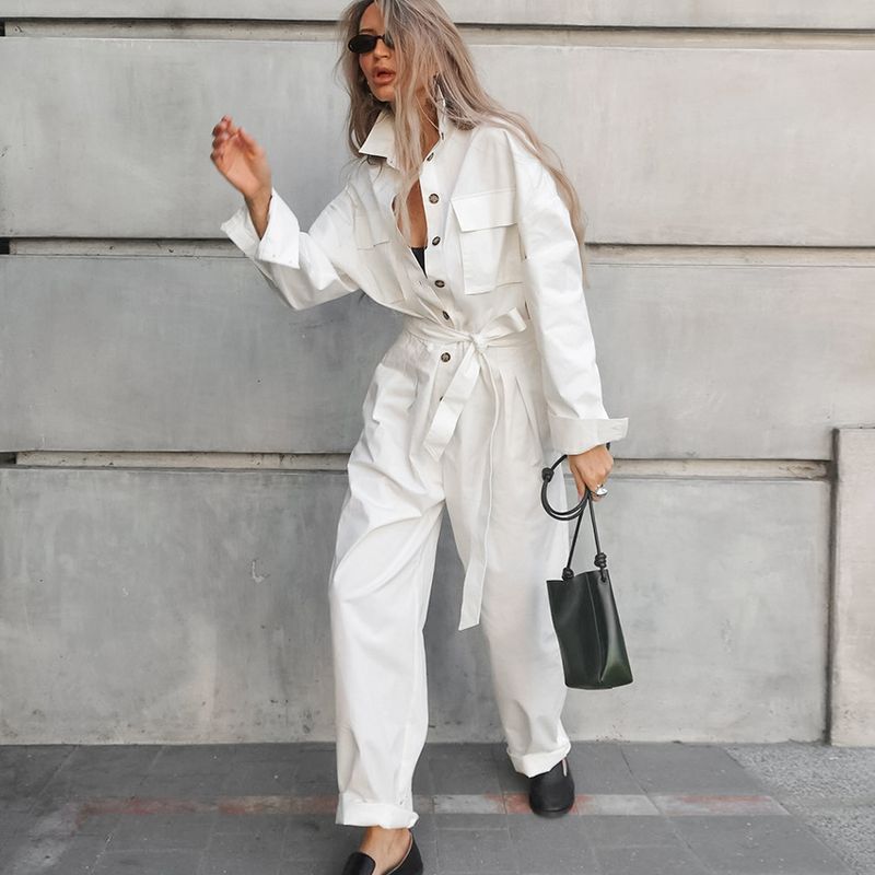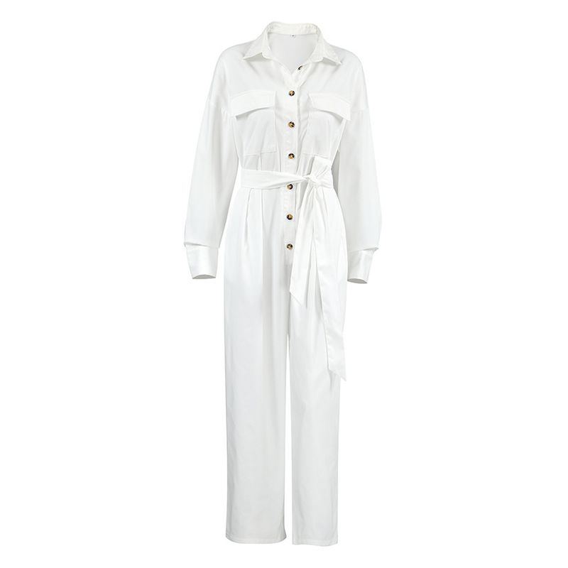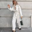 Fashion Polo Collar Long Sleeve Casual Wide Leg Jumpsuit S White