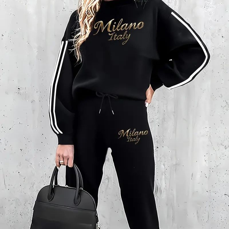 Fashion Round Neck All-matching Long-sleeved Trousers Casual Suit Black 2XL