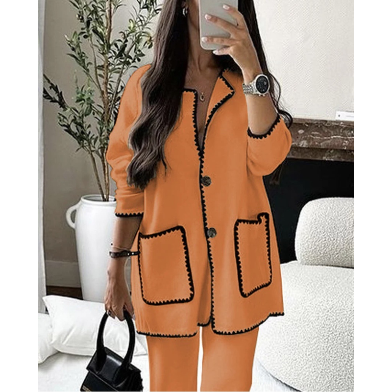 Color: white top, white pants, black top, black pants, white suit, black suit, Orange, camel