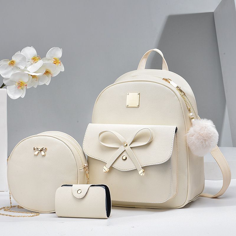 Fashion Women's Bags PU Bow Composite Bag Young Girl Student Cute Shoulders Backpack Crossbody Bags Coin Purse 3pcs Set White