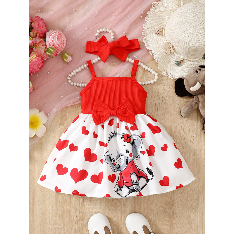 Fashionable baby girl summer trend cute heart with cartoon elephant suspender dress