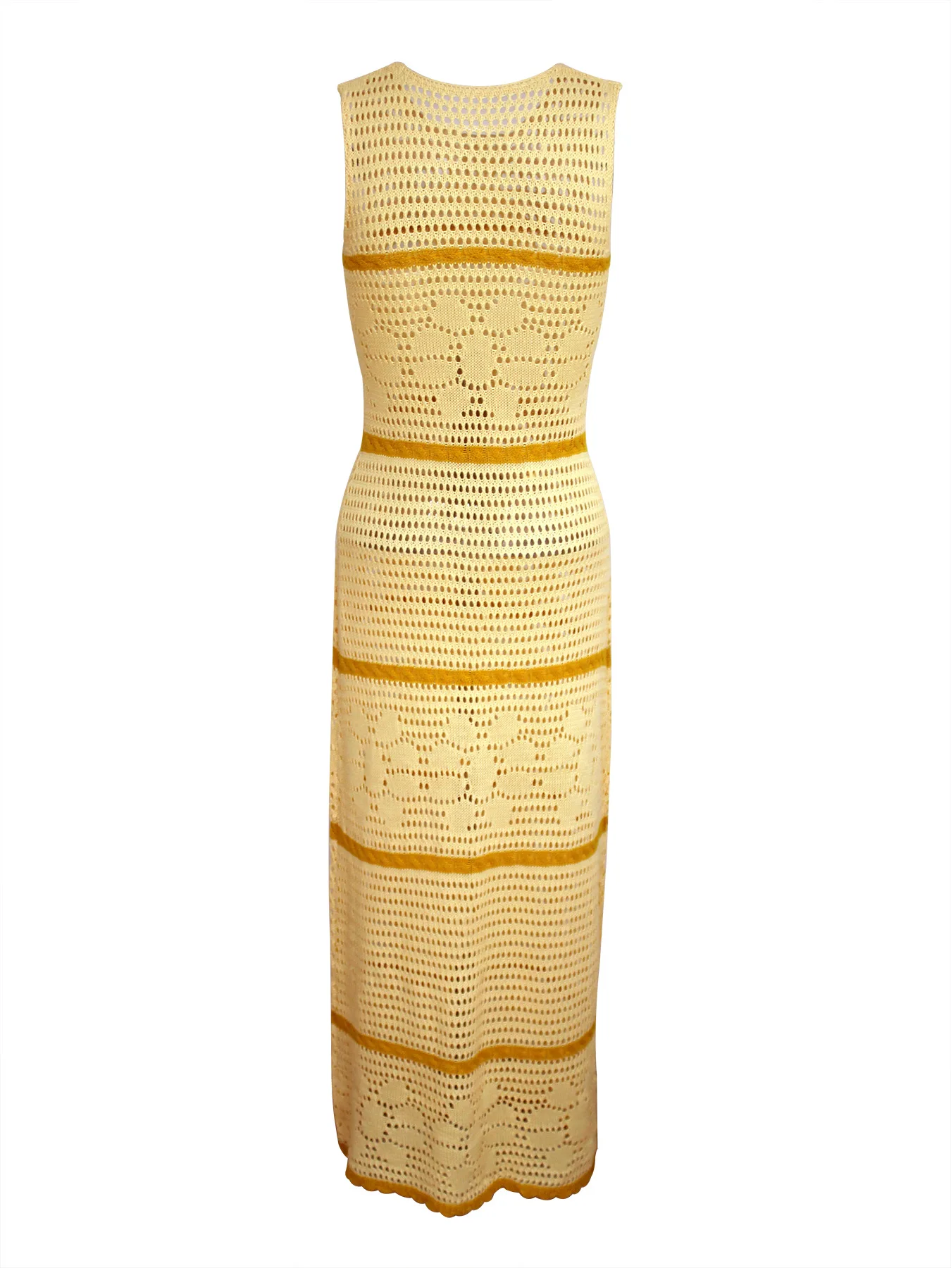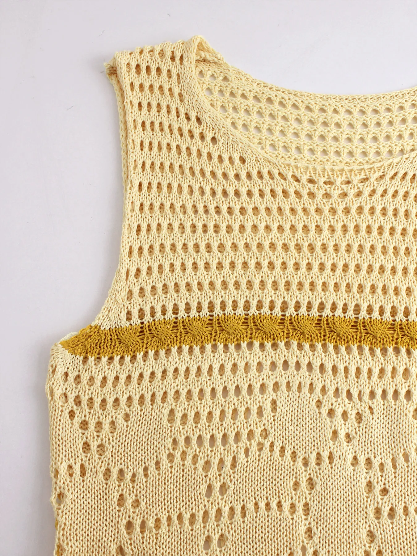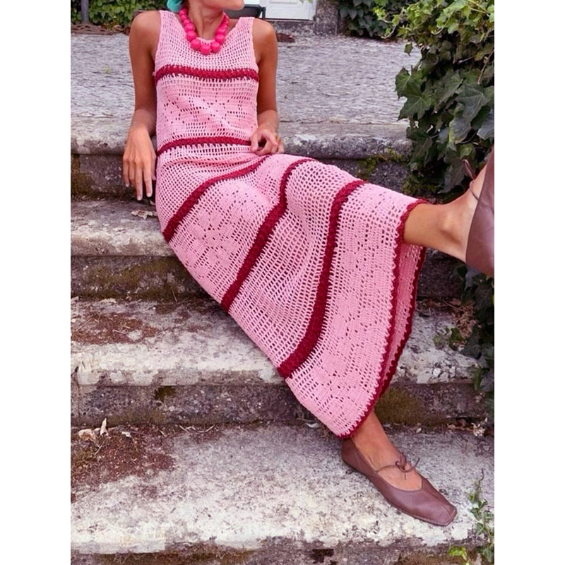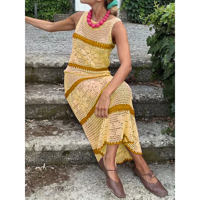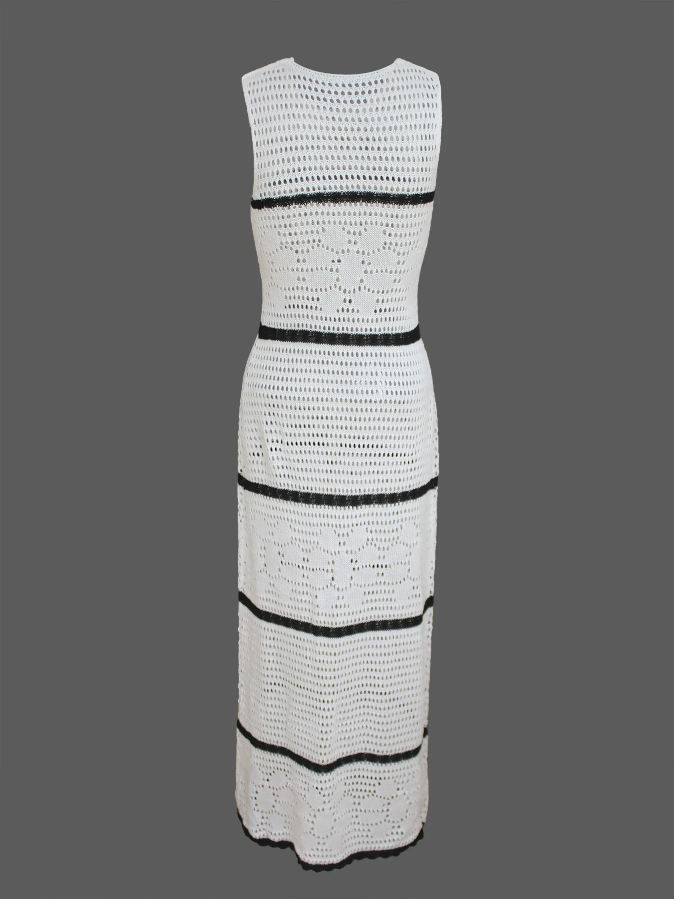 Fashionable Contrasting Hollow Knitted Long Skirt 2026 Spring Summer New Casual Beach Vacation Round Neck Sleeveless Vest Dress