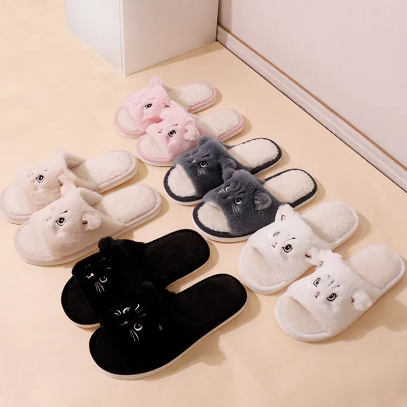 Faux Fur Cat Home Slippers for Couple Winter 2025 Warm Plush Soft Sole House Shoes Woman Plus Size 36-45 Non Slip Indoor Slides