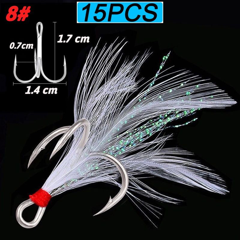 Feather Treble Hooks 1#-10# 15PCS Fish Hook Angle Barbed Sharp High Carbon Steel Nickel Antirust Lure Fishing Tackle Fishhook