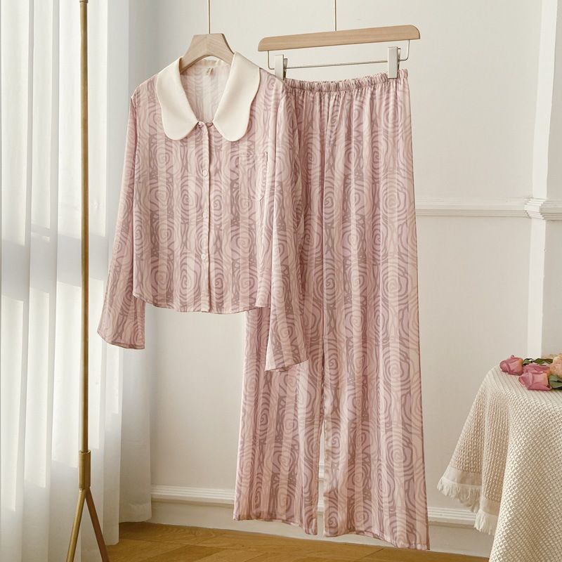 Female 2PCS Pajamas Set Spring Summer Print Flower Sleepwear Long Sleeve Trouser Suits Sweet Loose Satin Home Clothes Loungewear