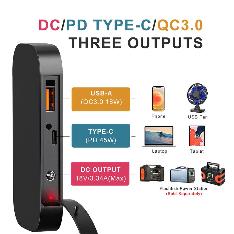 FlashFish power station is equipped with a lithium battery pack, it can be charged by the 15-24 volt solar panel (not included), AC wall adapter and car charger efficiently. No memory effect, no worry about battery capacity reduction.