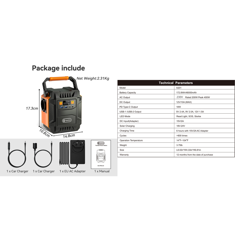 Flashfish portable power station EA200 is designed for outdoor activities' power supply. Small size (5.6lbs, 8.2x4.3x6.2 inch) with big capacity (151Wh), the most portable all-in-one power station can fulfill your demand for camping or emergency.