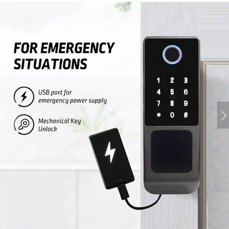 The smart door lock supports two emergency unlocking methods, mechanical key and USB emergency supply.