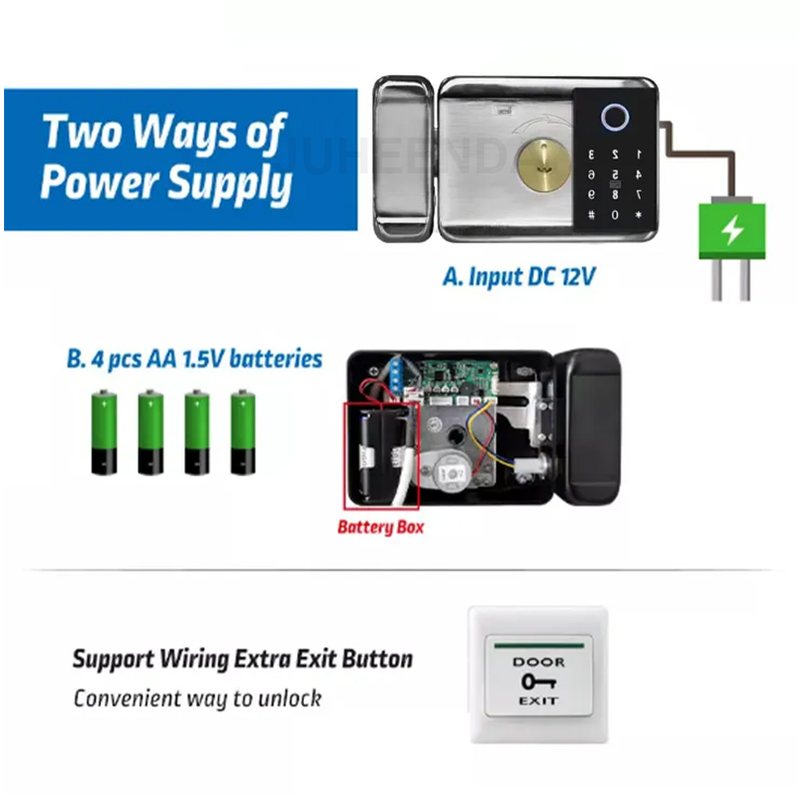 The smart door lock powered by 4pc AA batteries with a battery life of 6-8 months (battery is not included in the package).