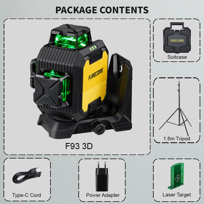 FIRECORE Professional Laser Level 360 12 Lines 3D Super Powerful Green Laser F93