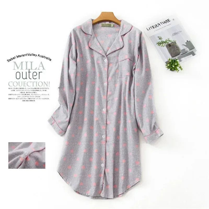 Flannel Cotton Home Nightdress Cardigan Shirt Night Dress Cute Cartoon Plaid Design Sleepwear Fashion Sleeping Shirt Woman