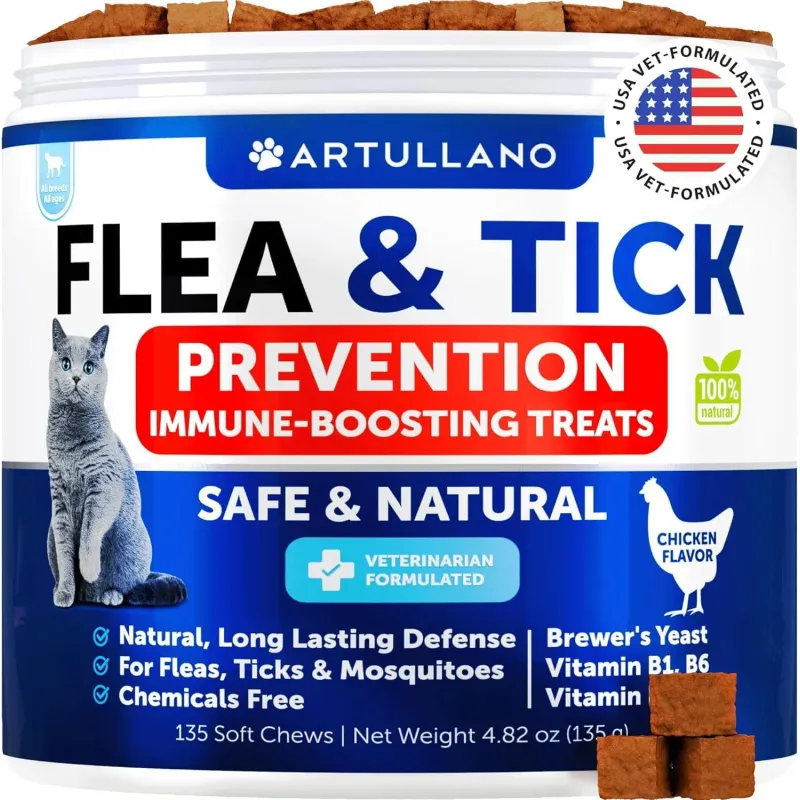 Flea Treatment For Cats Natural Flea And Tick Prevention Supplement For Cats Kittens Chewable Daily Oral Pills With Vitamins 135 Soft Chews Skin & Coat Dental Treats Digestion