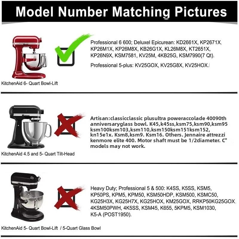 KD2661,KL26M,KP26M1,KP26M8,KP26N9,KV25G, KV25M。 This mixer is not suitable for Costco or Sams Club mixers KSM657, Not suitable for 5-quart (approximately 5-liter) bowl lift mixers and 6-quart glass bowls. Suitable mixing bowl size: diameter 9.75 inches, depth 6.75 inches.