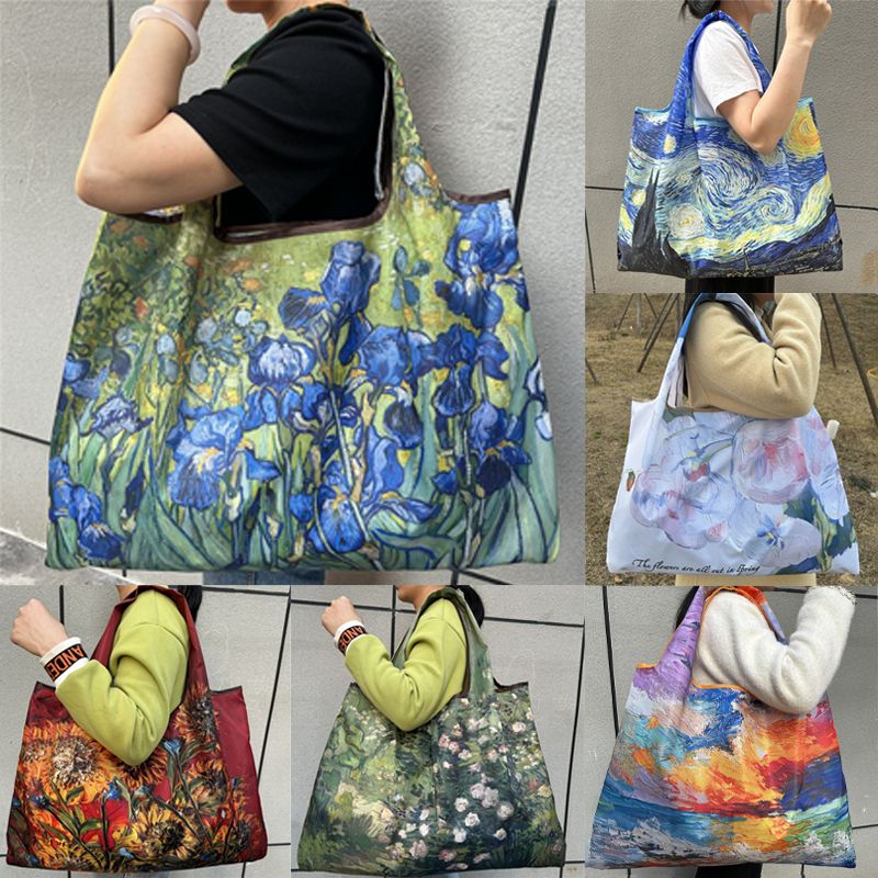 1.This artistic large capacity handbag is designed to combine functionality with oil painting style to enhance your daily tasks and outdoor activities. This foldable bag is made of durable Oxford fabric and decorated with vibrant oil painting style prints, making it easy to transition from a shopping store to a seaside vacation, providing a sustainable alternative to disposable plastics.