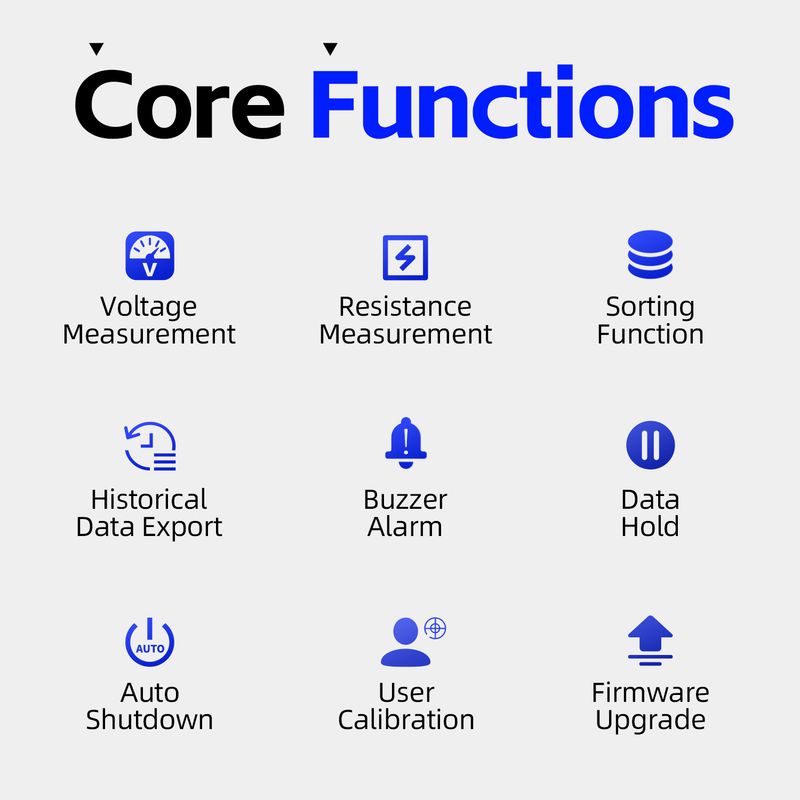 meter, designed with precision, convenient to carry. The device can automatically test internal resistance and voltage values simultaneously, with measurement results displayed on the screen. Users can also manually adjust the voltage and resistance range. The product features a sorting mode, automatically filtering the good and bad batteries based on user-set thresholds. It also supports historical records and exporting data tables of historical measurements.