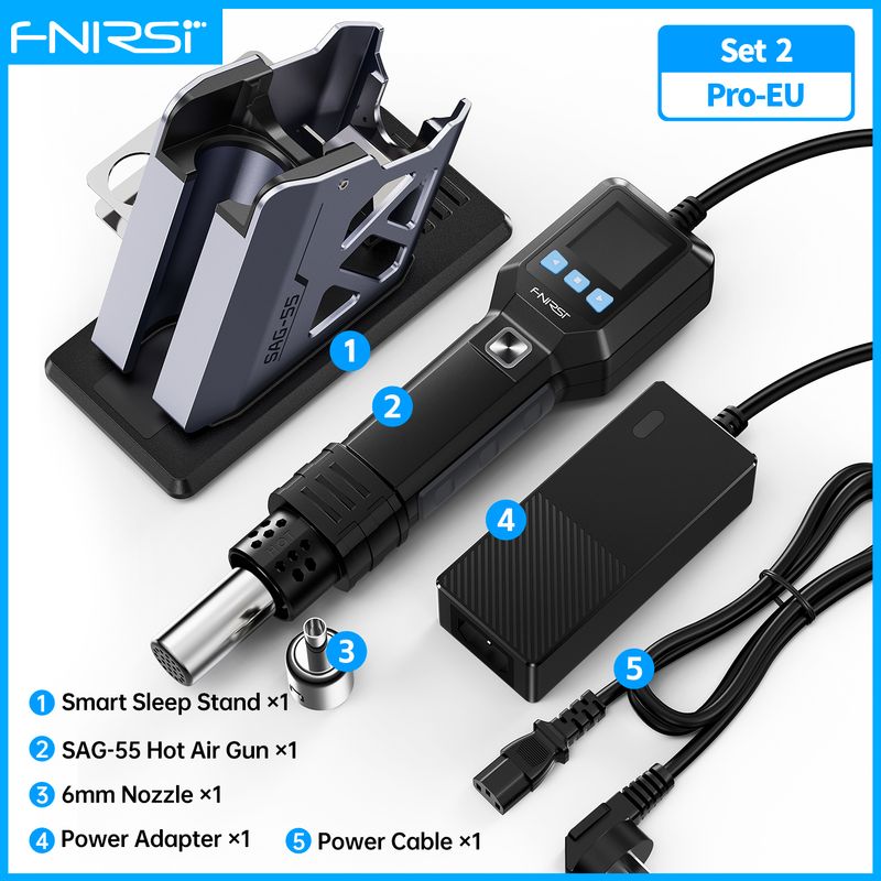 The SAG-55 Smart Hot Air Gun, developed by Shenzhen FNIRSI Technology Co., Ltd., is a compact, intelligent heat gun designed for a wide range of applications. It features microcontroller-based PID temperature control for fast heating with minimal thermal shock, protecting the heating element’s lifespan. A brushless fan with 20 adjustable speed levels ensures low noise and long service life, adaptable to various work environments.