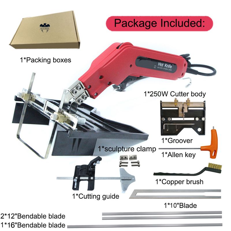 Installation:NOTE: Always unplug cord of the Thermal Cutter (Hot knife)before installing or removing the blades. Allow sufficient cooling time for blades, blade holders and metal thumb wheels before handing.1 x plastic suitcase