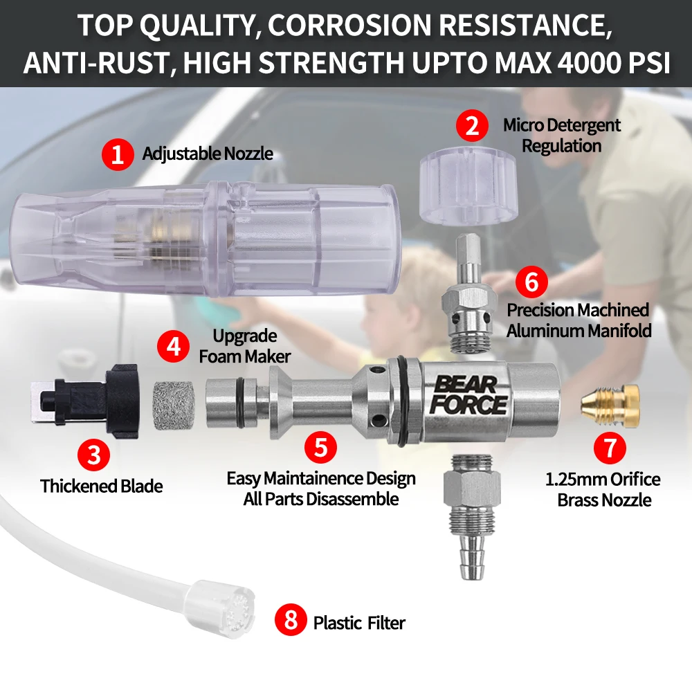 1. 100% guarantee that it will makes thick and dense foam for both home-use 110V / 220V and professional 380V pressure washer.