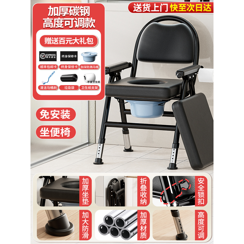 ‌Foldable Commode Chair, Non-Slip Toilet Seat Riser, Portable Bath Stool for Elderly, Adjustable Shower Seat with Backrest