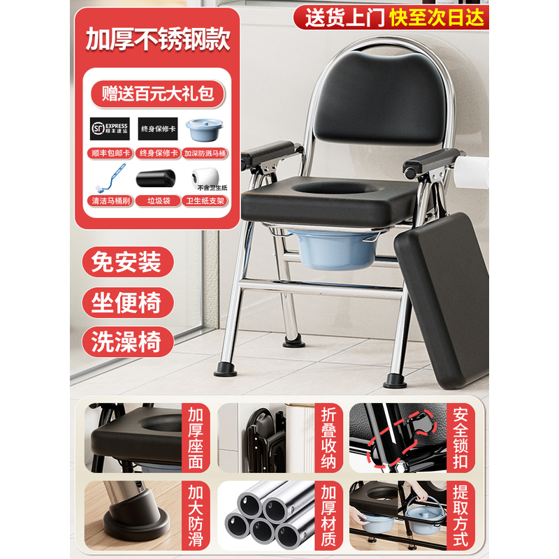 ‌Foldable Commode Chair, Non-Slip Toilet Seat Riser, Portable Bath Stool for Elderly, Adjustable Shower Seat with Backrest
