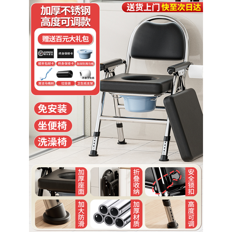 ‌Foldable Commode Chair, Non-Slip Toilet Seat Riser, Portable Bath Stool for Elderly, Adjustable Shower Seat with Backrest