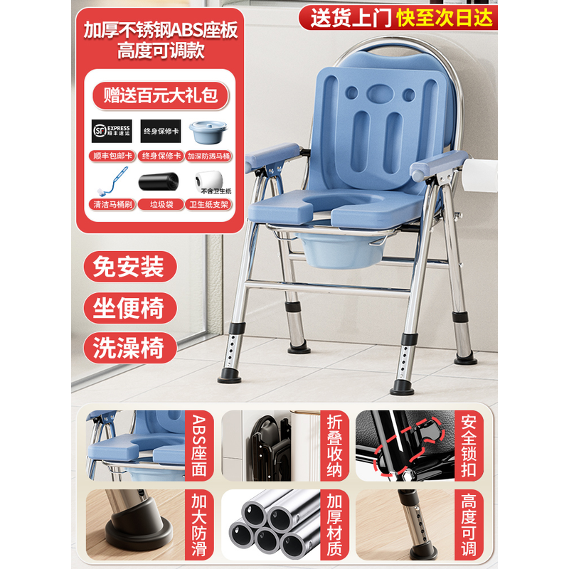 ‌Foldable Commode Chair, Non-Slip Toilet Seat Riser, Portable Bath Stool for Elderly, Adjustable Shower Seat with Backrest
