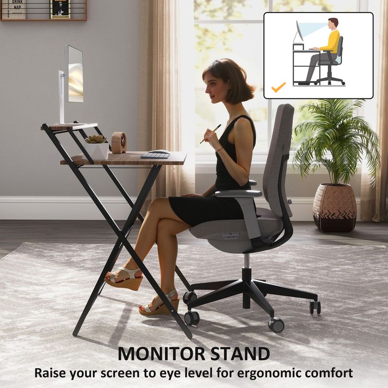 Meet your new workspace superhero—the small computer desk from [BRAND NAME], a true space-saver for your home office or study area. This compact study desk transforms any nook into a practical workspace. When you're done conquering your to-do list, fold it away—out of sight but never out of style. The top shelf doubles as a handy monitor stand or storage space, while the sleek X-shaped frame ensures stability. Unfold productivity, fold away the mess—upgrade your workspace today.