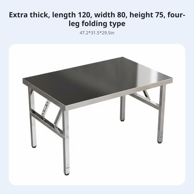 【sturdyDuty Construction】: Built entirely from thickened stainless steel, including the frame and surface, ensuring exceptional durability, rust resilience, and a high load-bearing capacity for professional and home use. 【Foldable & Portable Design】: Features a convenient rotating-foldfolding mechanism that allows the legs to collapse flat against the surface, making it easy to transport and retail outdoorlet in tight areas withoutdoor requiring any assembly. 【Thickened 4cm Surface】: The upgraded 4 cm thick countertop provides a sturdy and stable surface that resists pressure and deformation, making it perfect for sturdy tasks, food food food preparation, or supporting substantial weight. 【Stable Firm】: Engineered for stability with a reinforced leg frame, firmly fastened latching mechanisming mechanisms, and anti-slip foot pads. Larger type feature additional legs (6 or 8) to prevent wobbling and ensure a firm foundation. 【Versatile Application】: This versatile table is perfect for a wide range of settings, including professional kitchens, catering events, outdoordoor outdoordoor vending, camping trips, family dining, workshops, and as an additional office workspace.