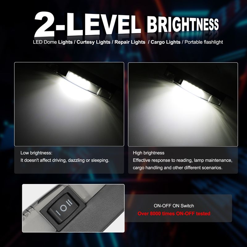 SOFTER BRIGHTNESS - Powered by 5 high-quality LED chips, the LED dome light can deliver lots of soft white light to illuminate the night but not blinding. 2 level brightness switches are available and up to 200% brightness, easy to solve the problem of low light at night or in dark areas.