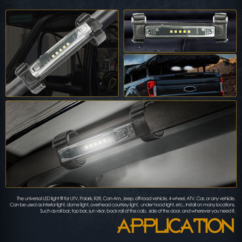 WIDE APPLICATION - Universal fit for UTV, SXS, ATV, truck, golf cart, chevy, honda, mule, boat and other applications, as roll bar light, roll cage light, cab light, trunk light, interior light, etc. Can be easily mounted on roll bar, roll cage, side of the door, trunk, engine bay inside, or wherever you want.
