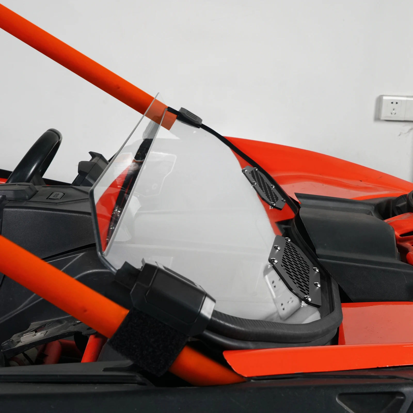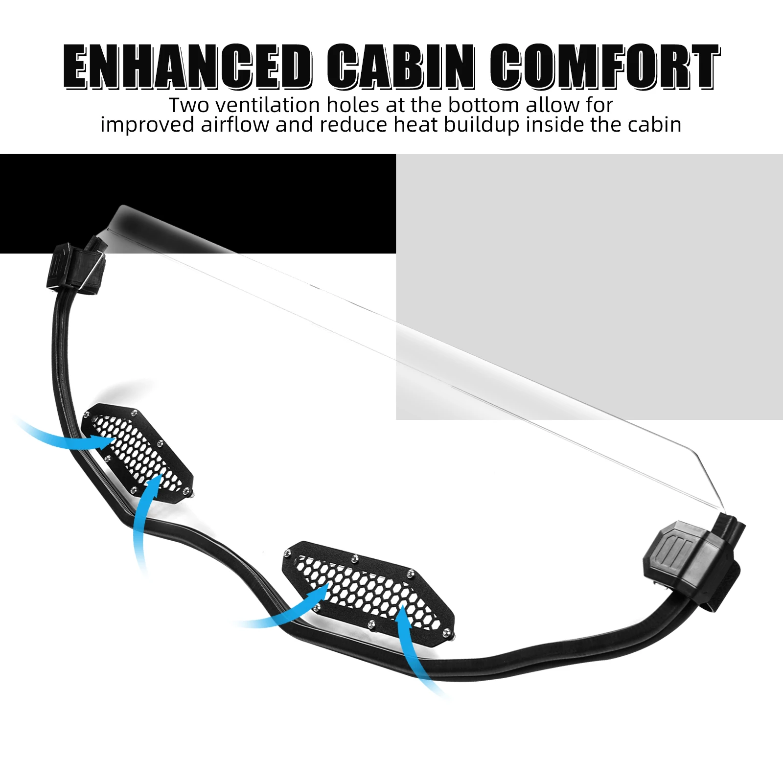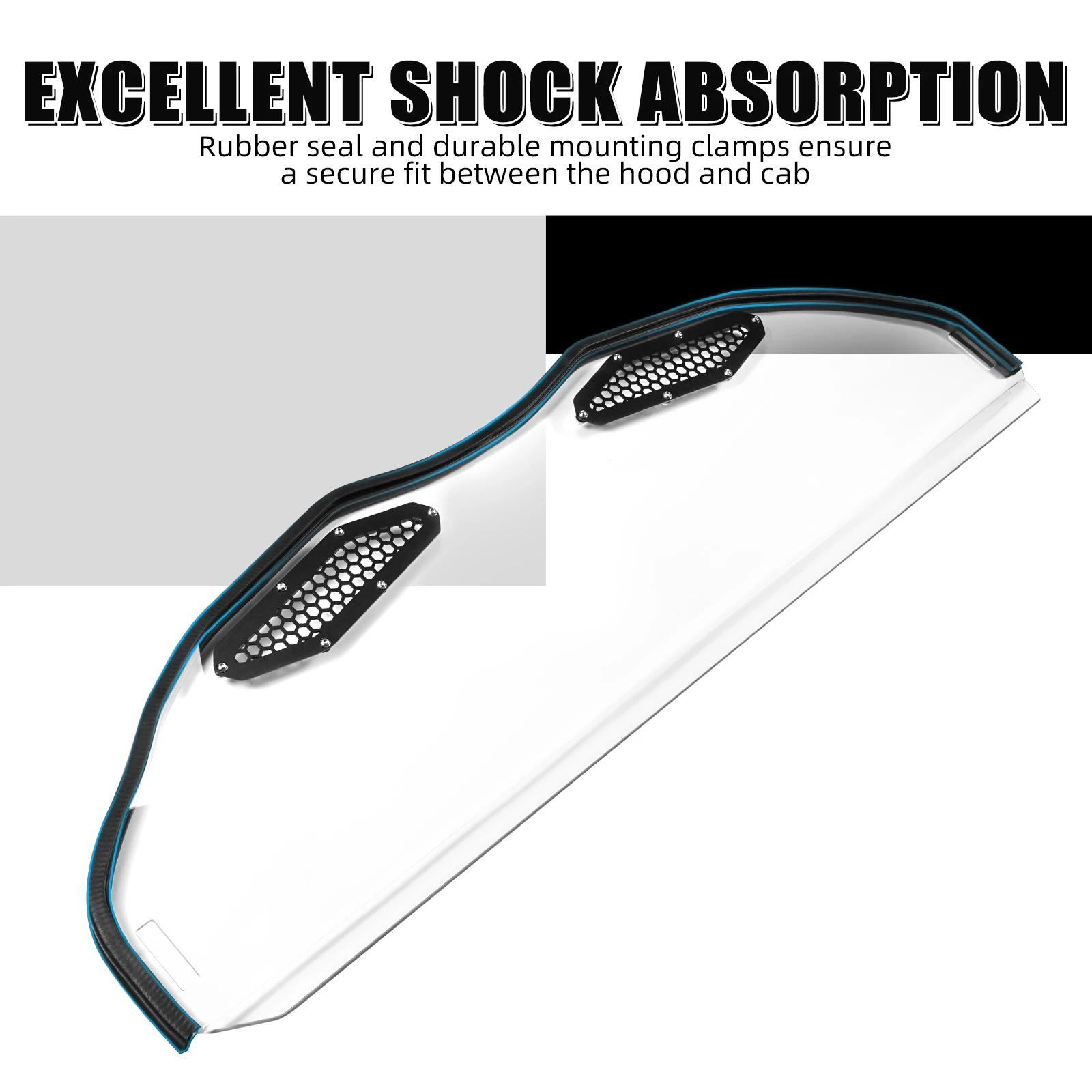 ăComplete AccessoryăX3 Front Half Windshield features a pre-installed rubber seal and durable mounting clamps, ensuring a secure fit between the hood and cab. It offers excellent shock absorption, reducing noise and rattling on rough roads.