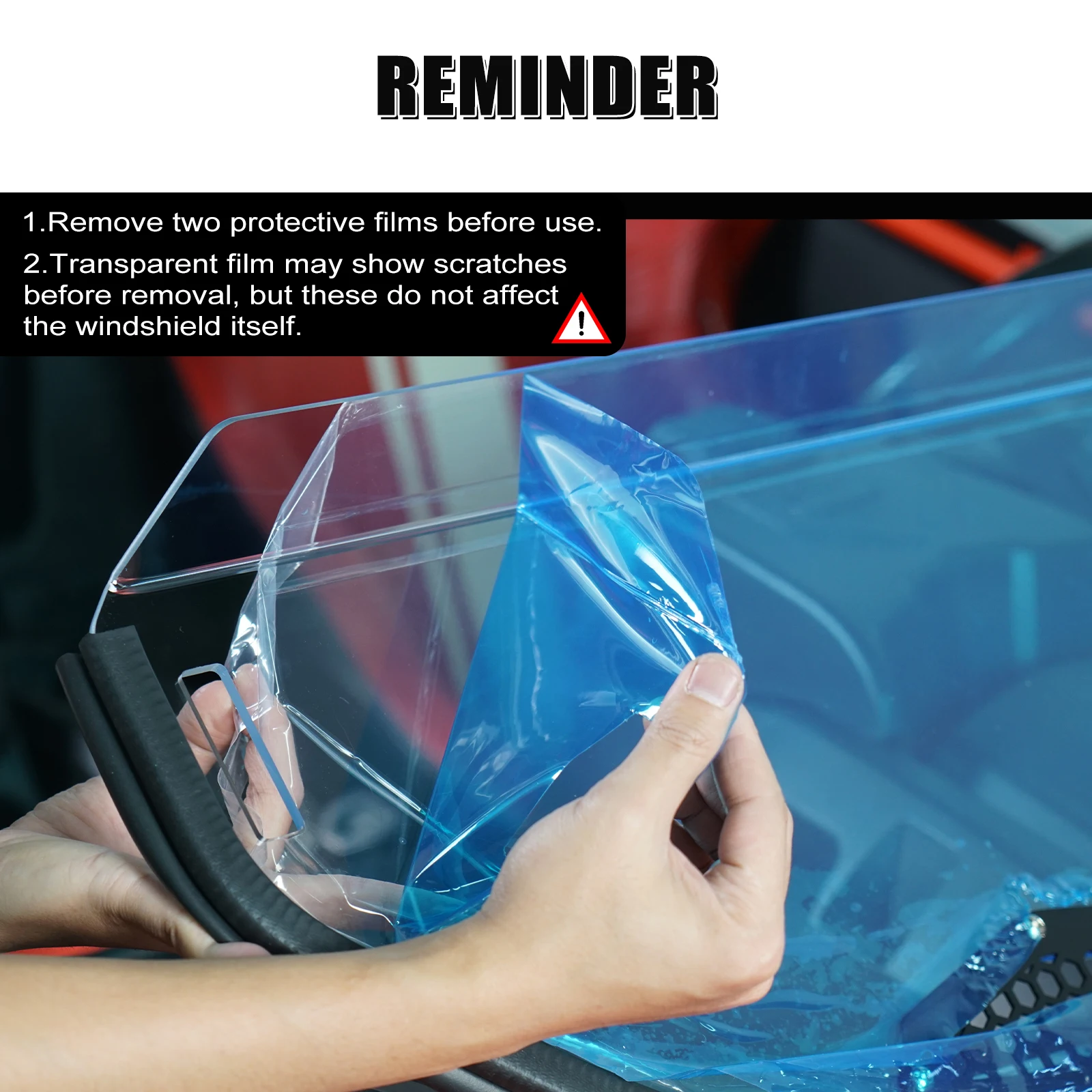 ăReminderăThe windshield comes with two protective films, a blue one and a transparent one. Please remove both before use. Note that the transparent film may show scratches before removal, but these do not affect the windshield itself. We mention this to avoid confusion