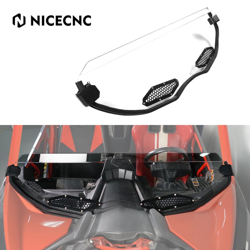 ăEnhanced Cabin ComfortăNICECNC can am x3 half windshield is designed with two strategically placed ventilation holes at the bottom, allowing for improved airflow and reducing heat buildup inside the cabin. Each hole is covered with a 2mm thick, laser-cut aluminum vent cover for added durability and a sleek, finished look.