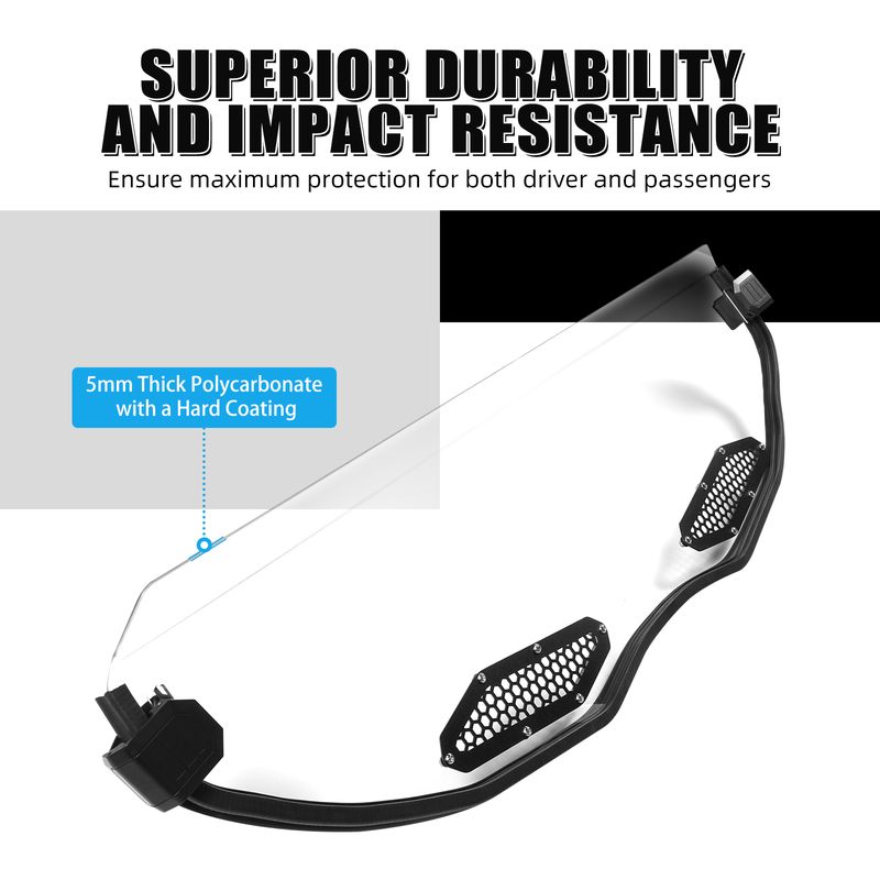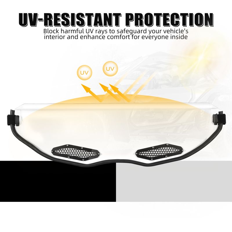 ăUV-Resistant ProtectionăThe Maverick X3 half windshield features a UV-resistant coating, effectively blocking harmful UV rays to safeguard your vehicle's interior and enhance comfort for everyone inside.