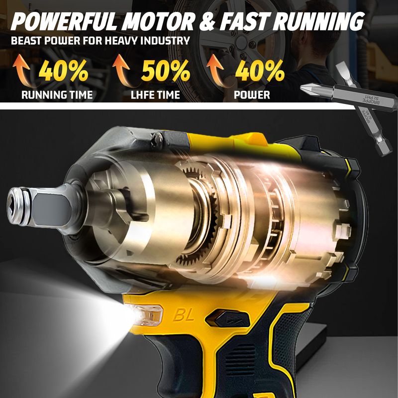 【High-Efficiency Motor &700N. m Torque 】Compared with brushed motors, brushless motor have strength in better performance and longer durability, with less noise and no sparks. Our wrench motor impact speed is top-notch, reaching 700N. m within several seconds. And the max speed is 32500RPM, saves your time and energy, suitable for tires removal, automotive repairs and construction projects