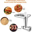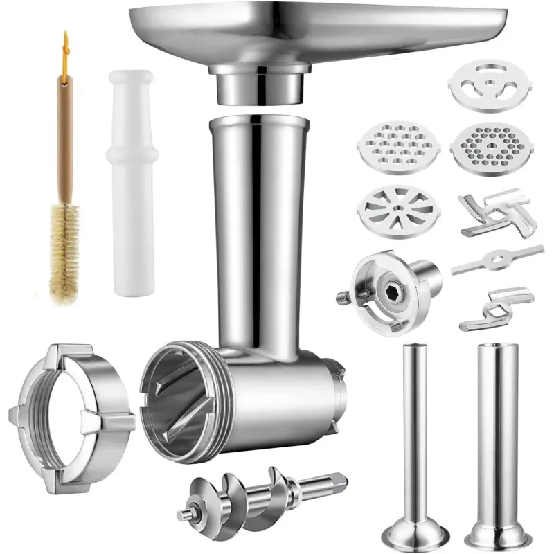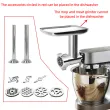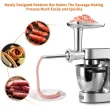 The pre cooling grinder can maintain a cold grinding temperature for clean grinding with meat. Just connect the accessory to the power wheel hub of the vertical mixer and let the mixer complete all the work. The design includes fine, medium, and coarse grinding discs, sausage filling clips, and two sausage filling tubes to meet your needs.