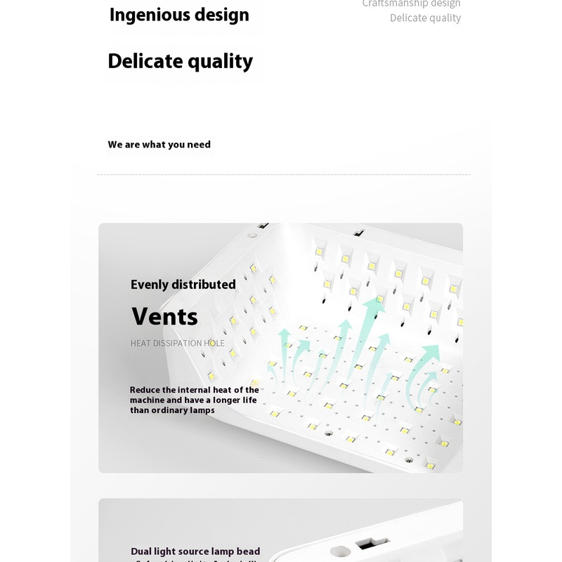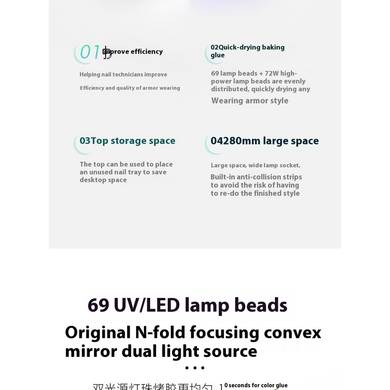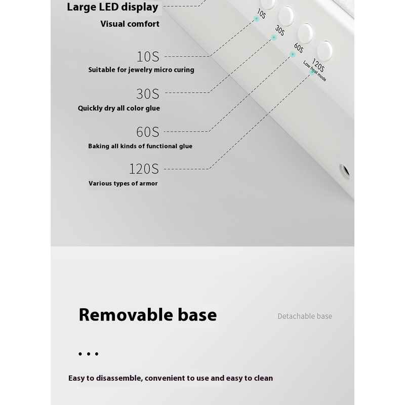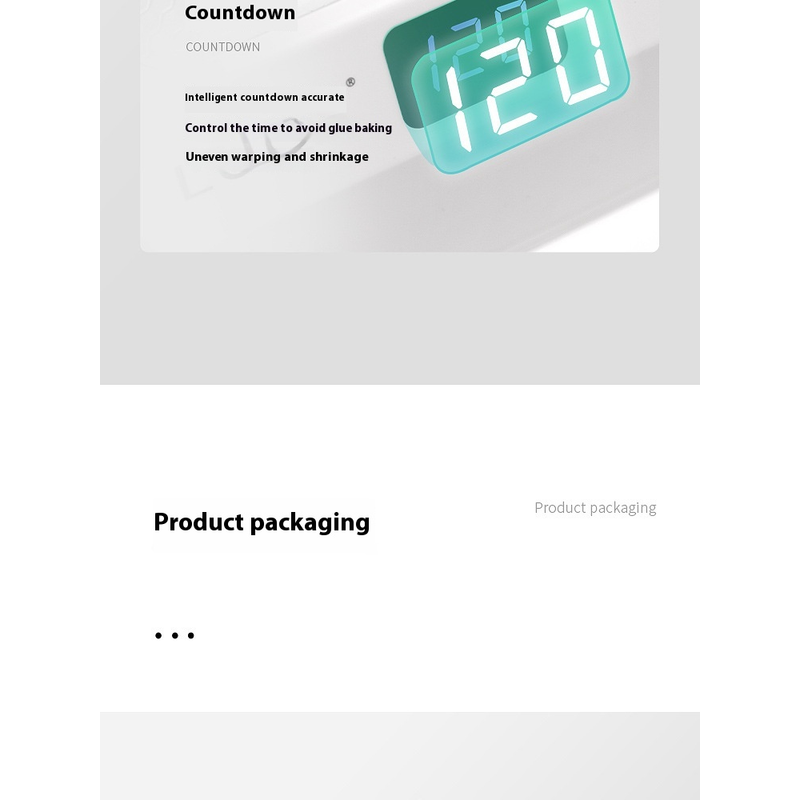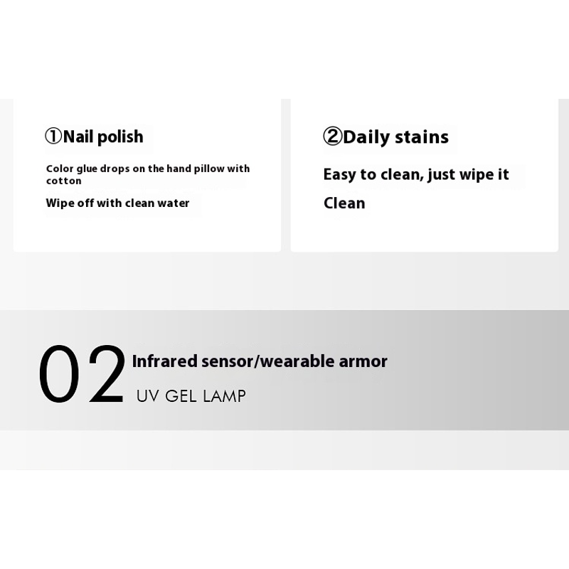 Can be used for wearing armor; UV/LED dual light source quick drying; Large space for holding hands; High definition digital display screen, clear at a glance; PU hand pillow is comfortable and convenient; Infrared induction; 10s, 30s, 60s, 120s four gear timing