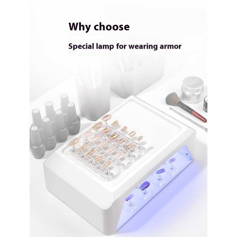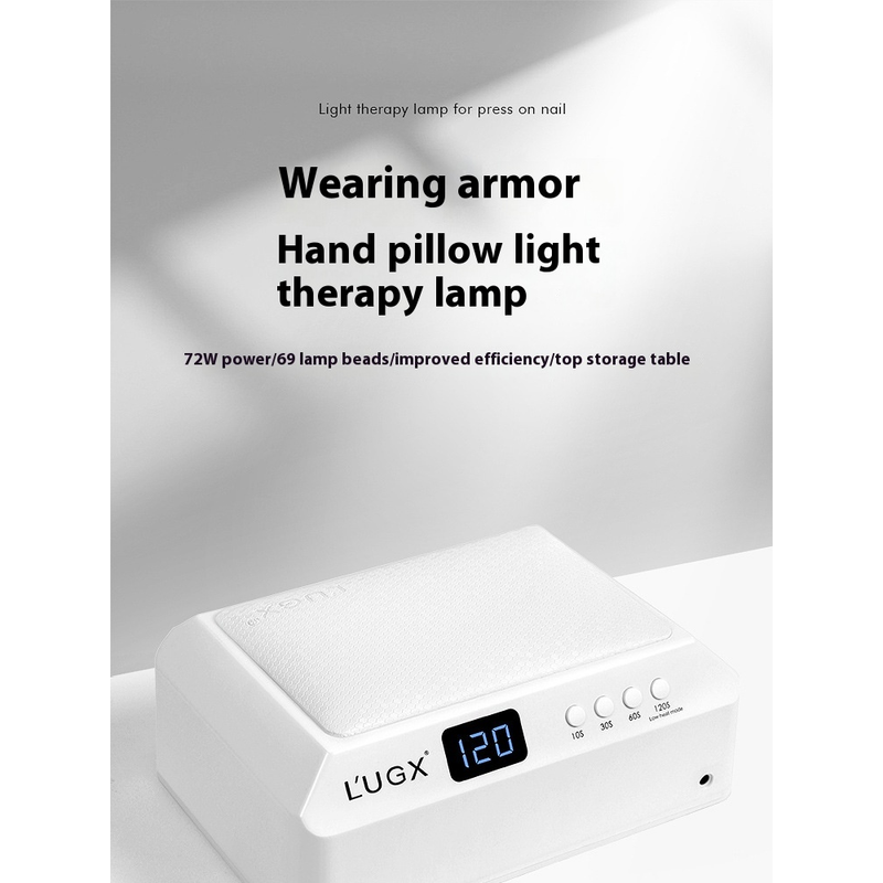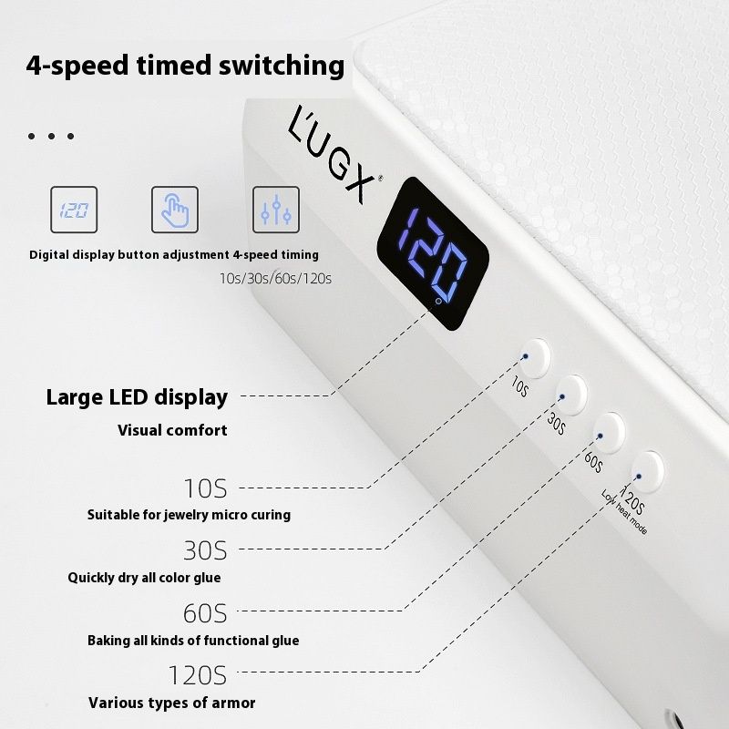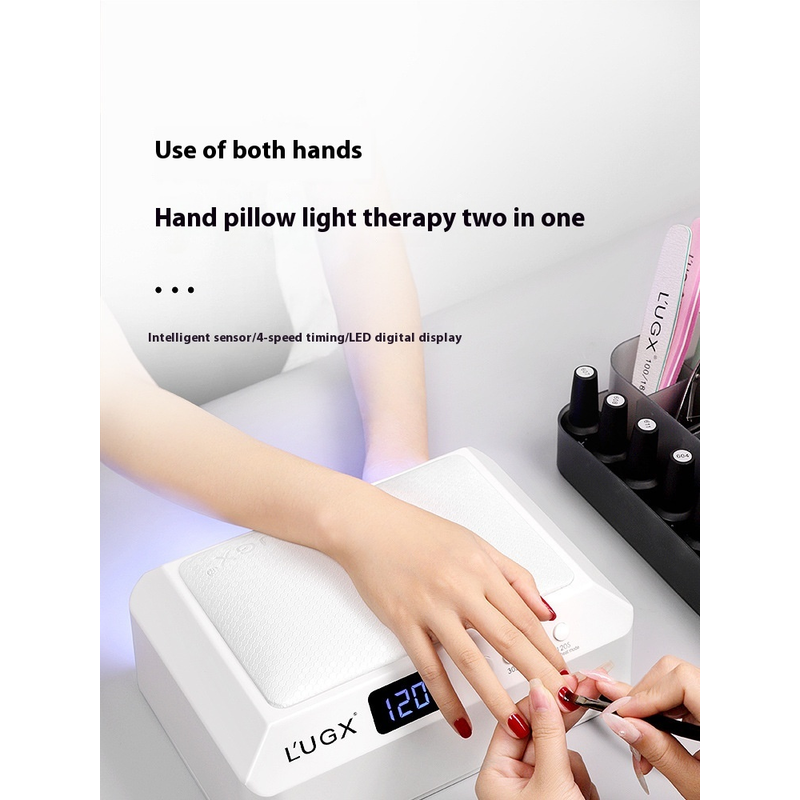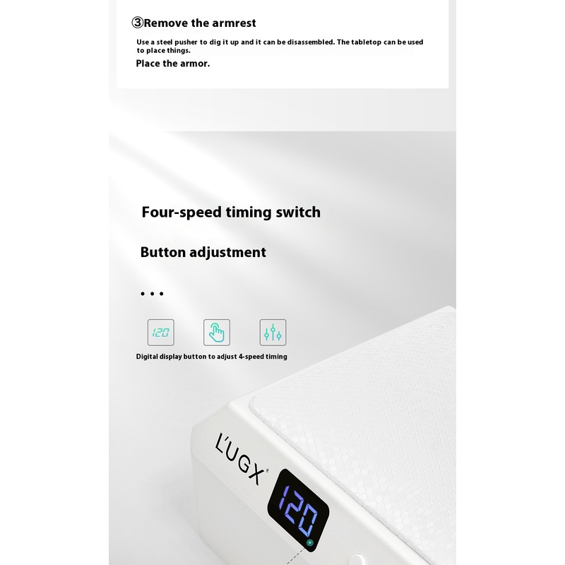 Can be used for wearing armor; UV/LED dual light source quick drying; Large space for holding hands; High definition digital display screen, clear at a glance; PU hand pillow is comfortable and convenient; Infrared induction; 10s, 30s, 60s, 120s four gear timing
