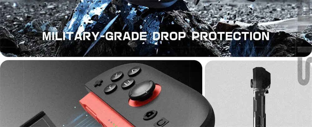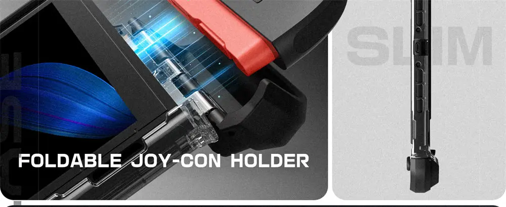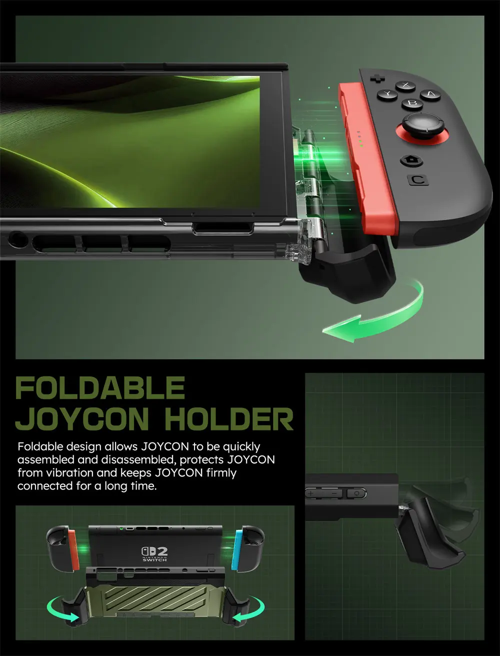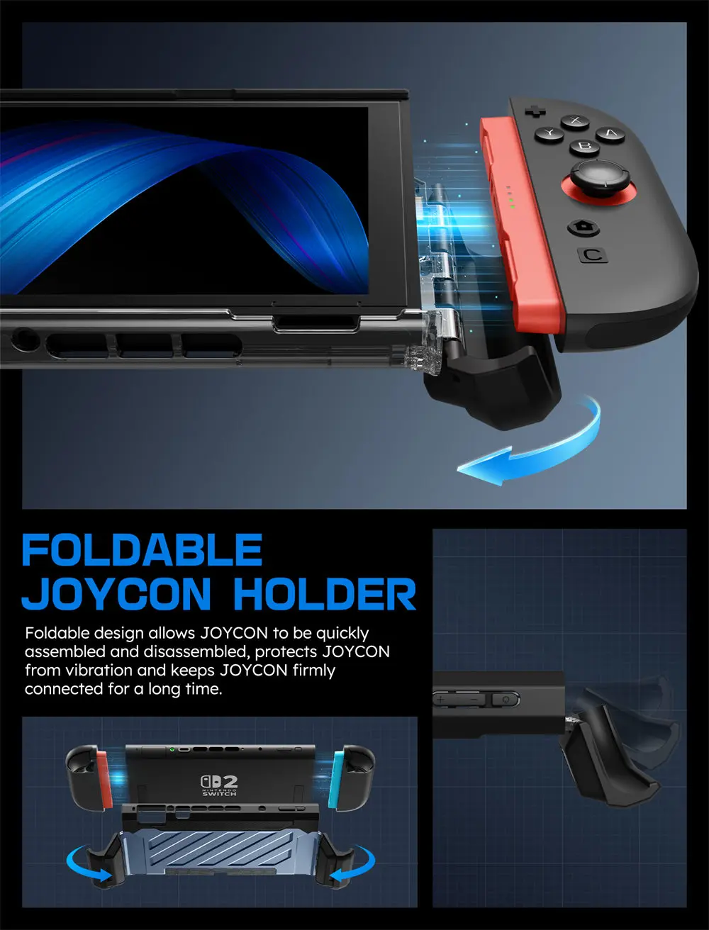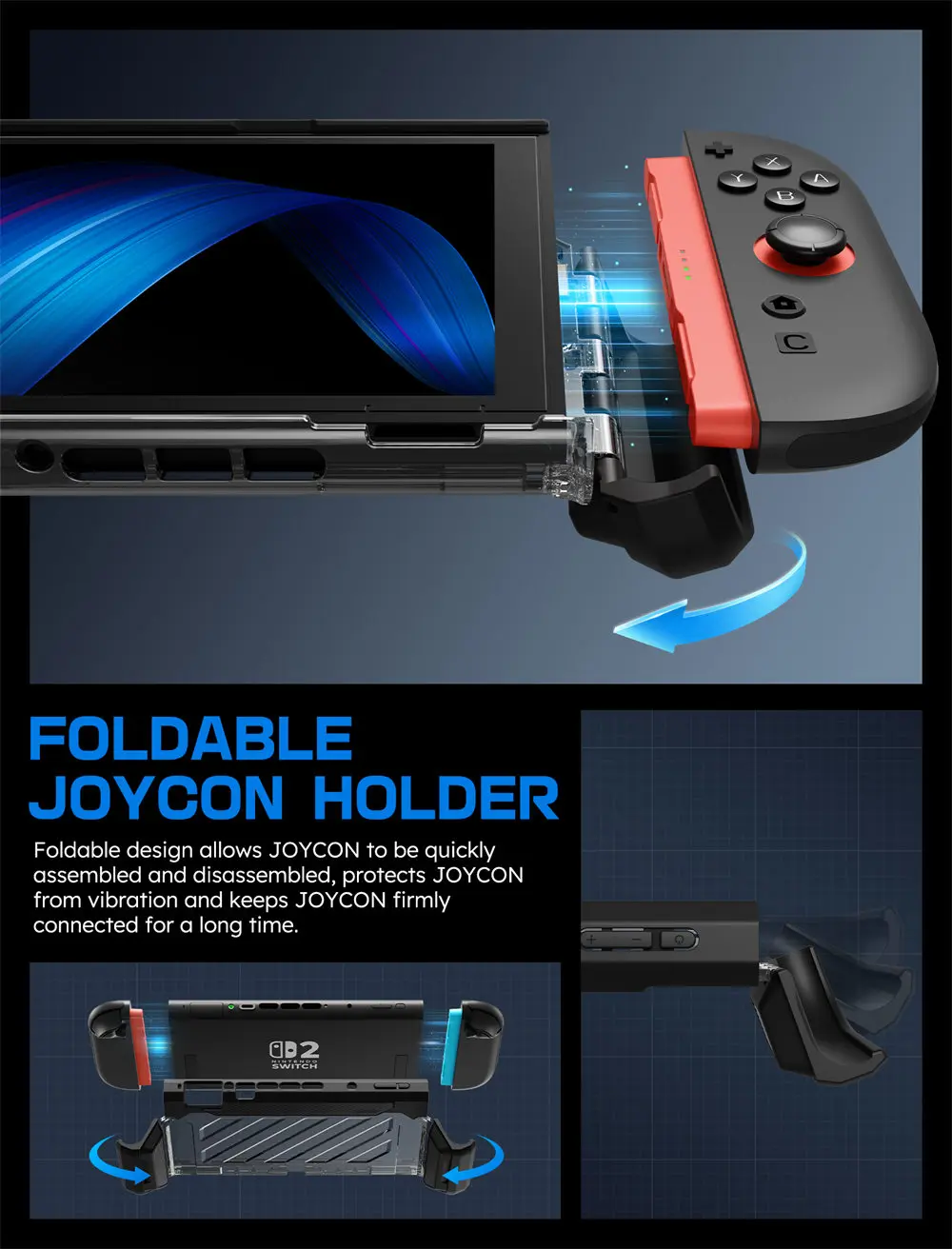 [Foldable Joy-Cons Coverage]: Revolutionary hinge mechanism enables Joy-Con controllers quickly assembled and disassembled, protects Joy-Cons from vibration and keeps Joy-Cons firmly connected for a long time.