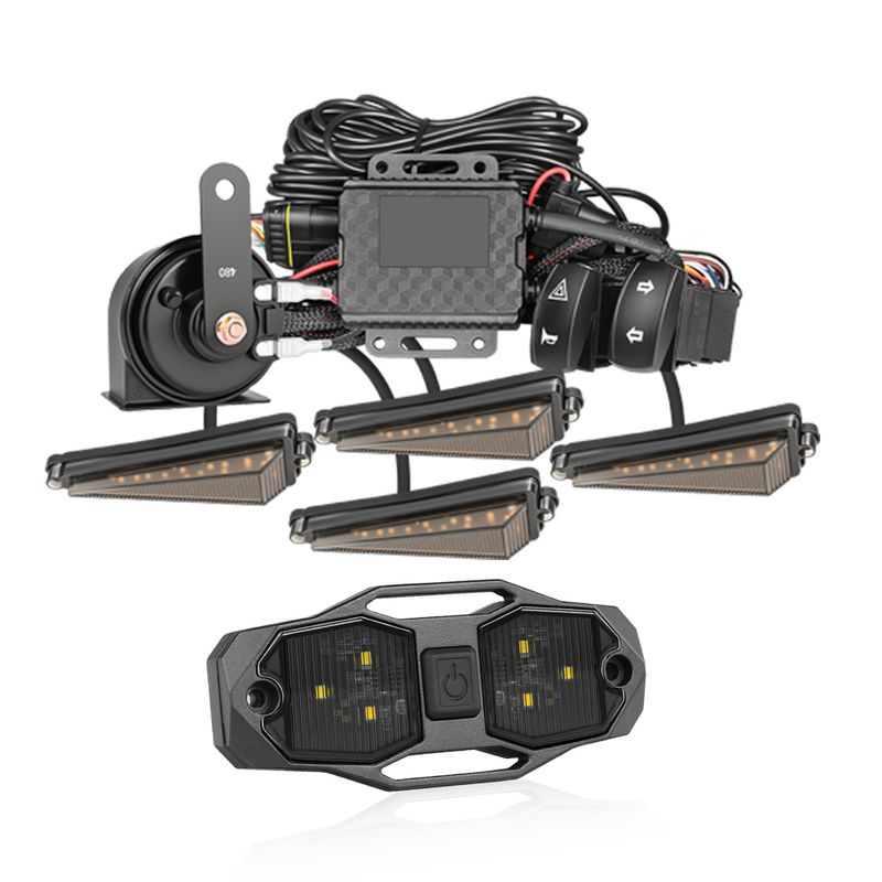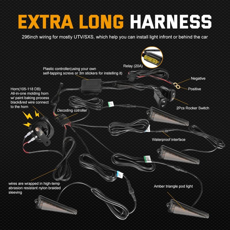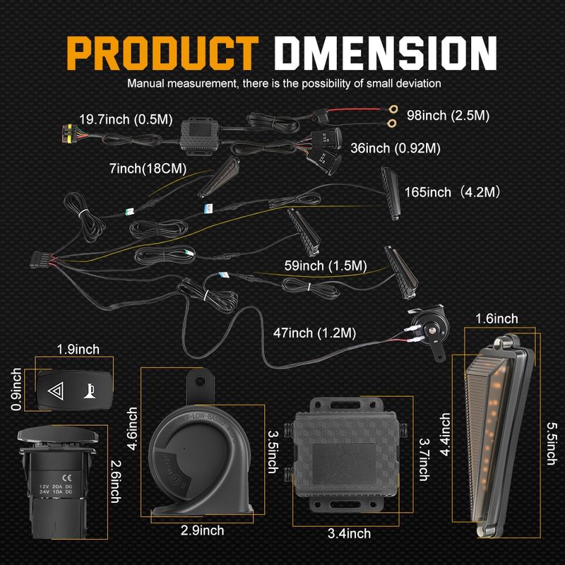 Package Includes: The turn signal kit comes with an upgraded wire harness length that can accommodate vehicles up to 220 inches long. Color lines are marked on the corresponding installation location, making installation more efficient. The kit includes all necessary accessories, including amber turning signal lights x4, 110db horn x1, left/right rocker switch x1, hazard, horn switch x1, harness set x1, relay x1, nylon cable ties set x1, and an installation guide x1