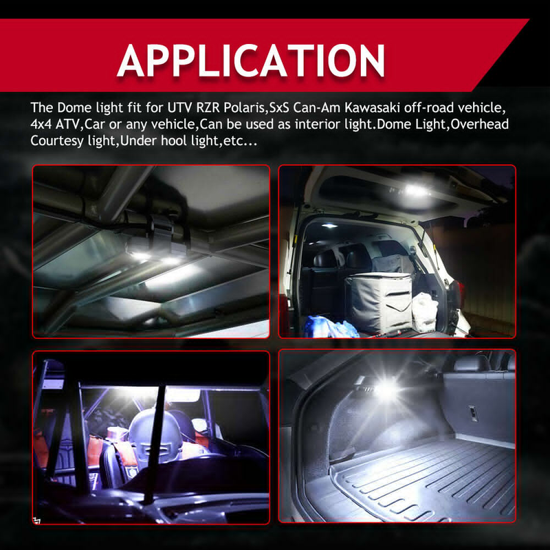 These LED lights are IP 68 waterproof and can be mounted virtually anywhere. All that is needed is 12 volt power. They have a 180 degree optic to illuminate your cab, engine bay, wheel wells or anywhere else you need a bright and smooth light.Light up the cabin of your cab with Universal LED Dome Light Kit! This easy-to-install LED Dome Light is both practical and enjoyable,These Universal LED Dome Light Kit are easy to install, each dome light features an 16" Velcro strap to easily fix to the inside of your cab and fits up to 4" roll bars. Each Universal LED Dome Light Kit features an IP68 Waterproof design, guaranteed to resist dust and even prolonged water immersion.