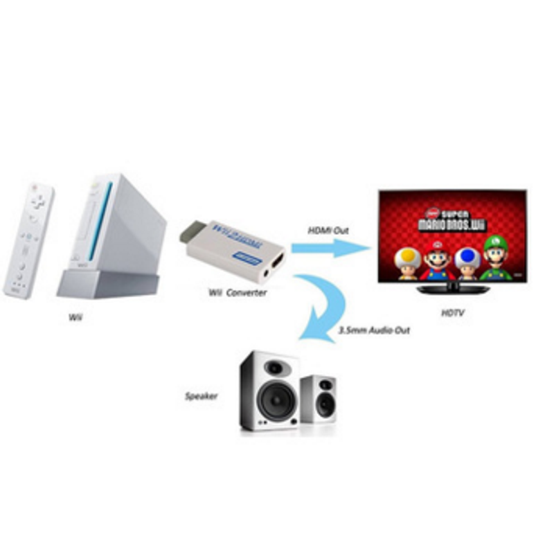Wii2HDMI a great mini converter for the Wii console, outputs video and audio in full digital HDMI 720p or 1080p format and supports all Wii display modes (NTSC 480i 480p, PAL 576i). With just one HDMI cable, plug and play for true-to-life video/audio effects on your HDTV/monitor.