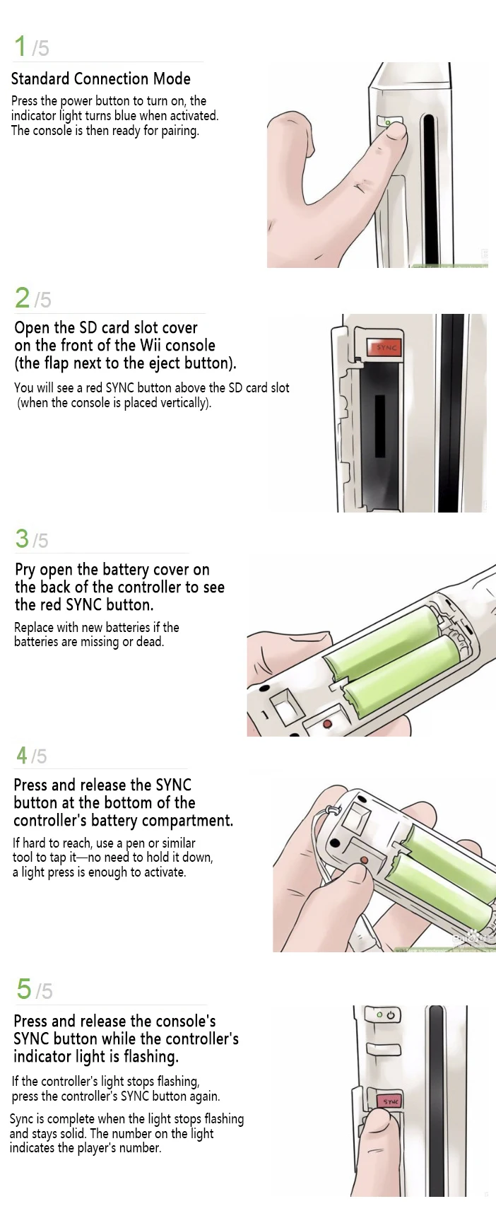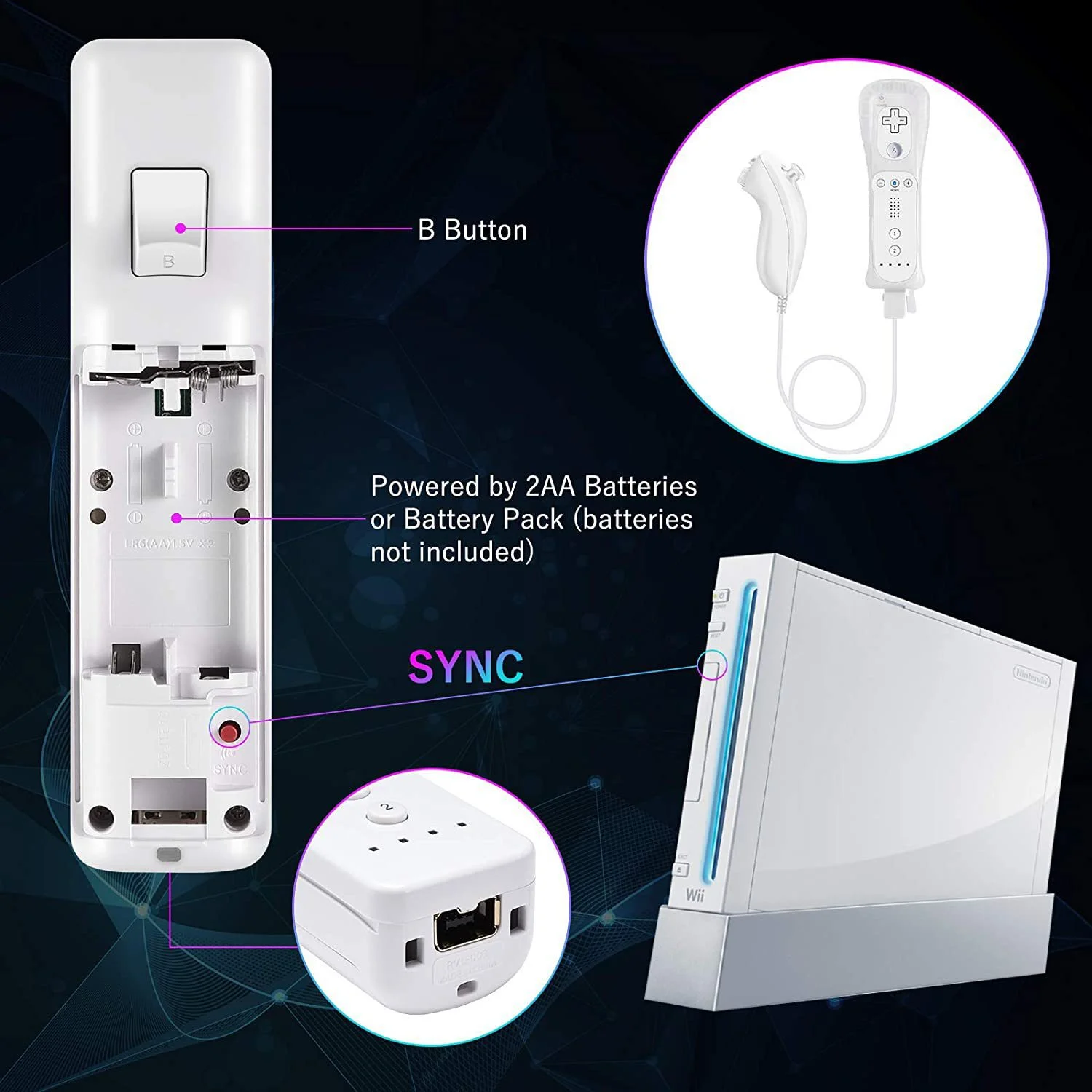 Combination of straight handle and curved nunchuk, compatible with all Wii and Wii U console series. Built-in Bluetooth module enables one-click pairing via the SYNC button for stable, lag-free connection.