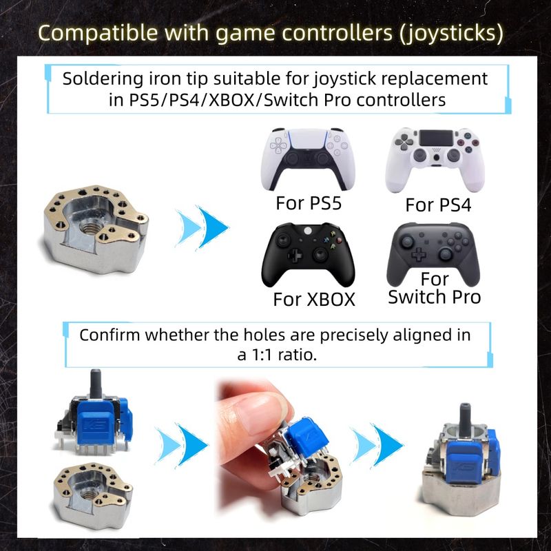 ⚠️The soldering iron tip is fully compatible with the joystick pins of PS4, PS5, XBOX Switch Pro:"Precise positioning of holes"Our joystick heads are suitable for replacement in the following controllers: PS5, PS4, XBOX (XBOX ONE, XBOX Series S, XBOX Series X), and Switch Pro. They are not compatible with other controllers. Please be advised.