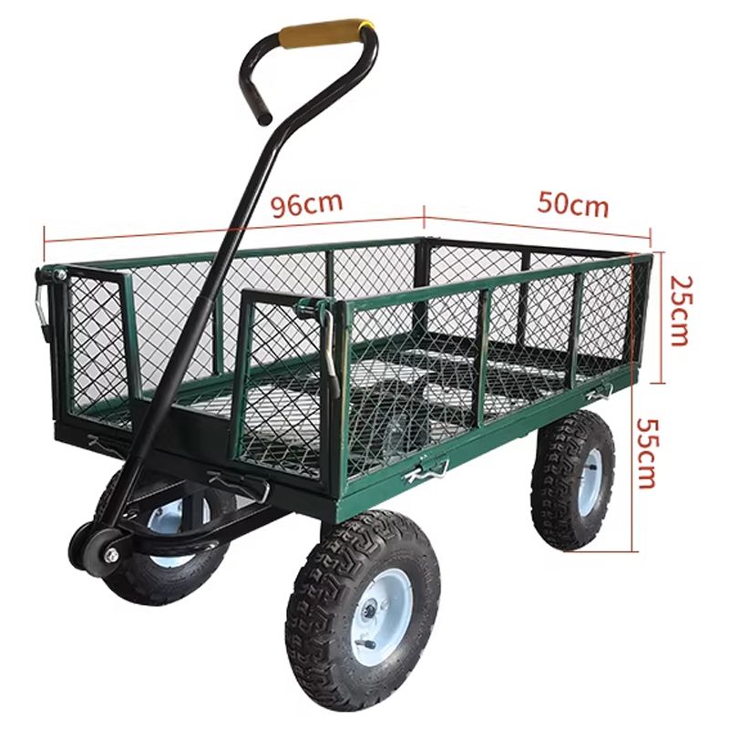 Four-wheeled handcart with rubber pneumatic tires; portable handcart for transporting food, flower pots, and other goods.