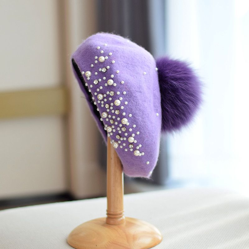 Fox Fur Ball Beret Female Woolen Pearl Purple M