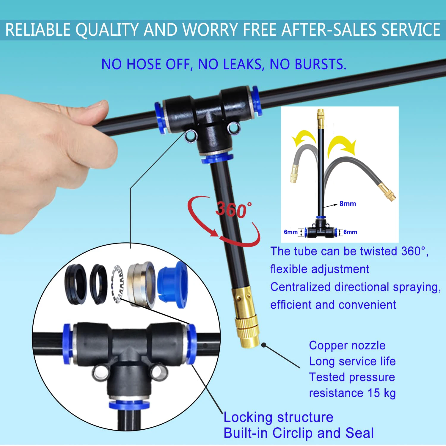 --The new material PE pipe can withstand 10 kg of pressure. Copper sprinklers and tubes have a long service life and good atomization effect.