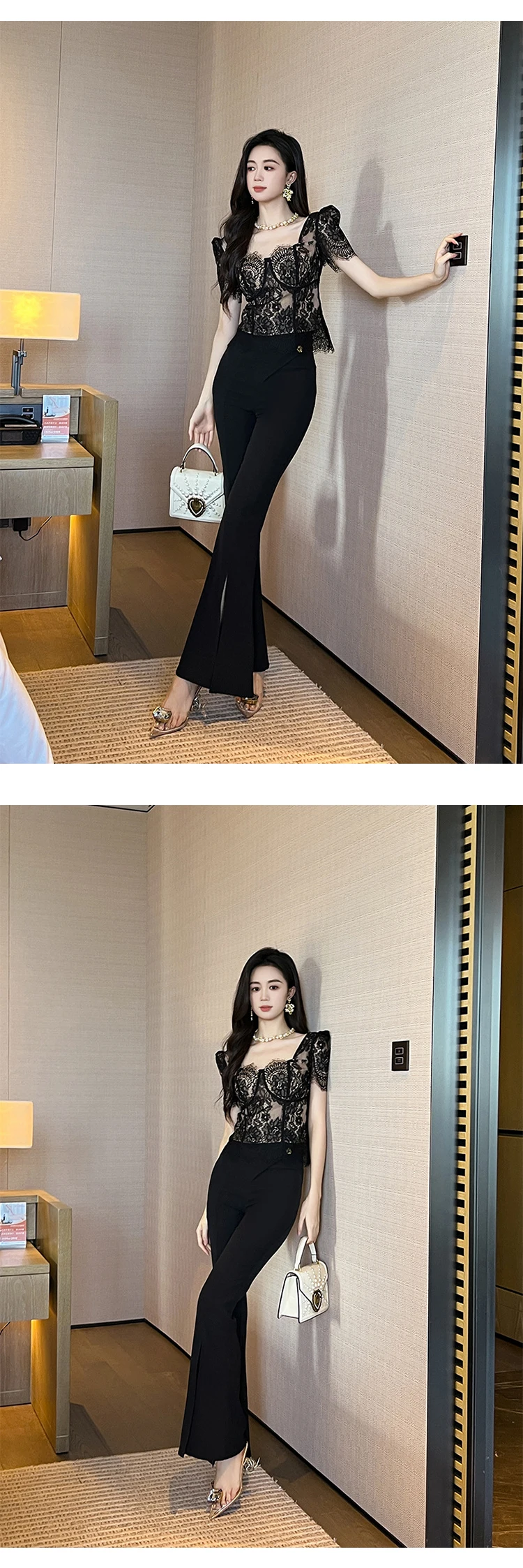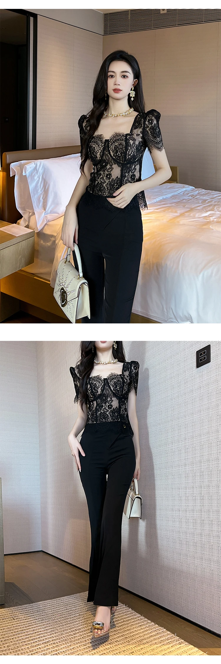 French Fashion Elegant Black Blouse Hook Floral See Through Women Tops Outfits Sheer Lace Sexy T-Shirts Tees Party Sweet Clothes